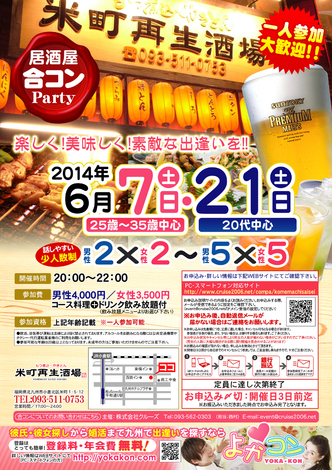 6月7日(土)第11回米町再生酒場コン☆25歳~35歳中心☆~一人参加・初参加大歓迎~