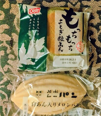 もっちもっちよもぎ粒あんと白あん入りメロンパンを食べました。