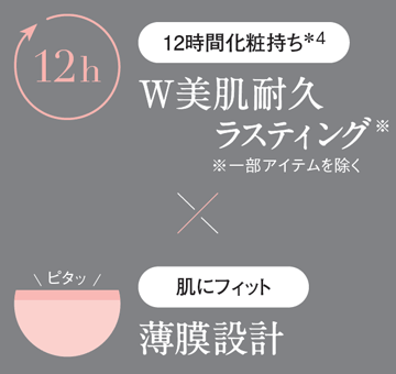 12時間化粧持ち※4するW美肌耐久ラスティングと、美容液のようにみずみずしく肌になじみ、つけていることを忘れるほどの薄膜設計。毛穴や色ムラを長時間カバーします。