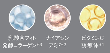 ※1 うるおい成分・製品の抗酸化剤 ※2 乾燥ダメージ保湿成分 ※3 乳酸桿菌/セイヨウナシ果汁発酵液、加水分解コラーゲン(肌にうるおいとハリを与える保湿成分)