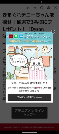 使用している物が、かなり古いドライヤーなので、画面消える前に応募しました。いきなり登場したからびっくりしました。テニーちゃん発見!と何か書かないといけなかったのかも忘れました。ただ、発見したことにびっくりです。彼方此方飛び回っているのでしょうか?
