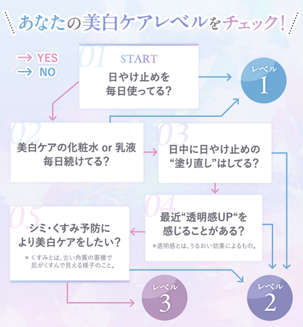 まずは、テーマ内のフローチャートに沿って導かれた、あなたの美白ケアレベルをチェックしてください。