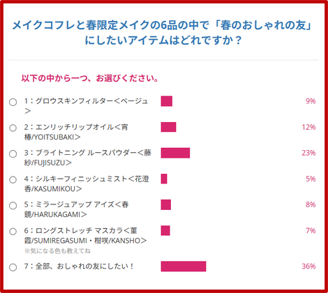 みなさんにお伺いしていたアンケート、「メイクコフレと春限定メイクの6品の中で「春のおしゃれの友」にしたいアイテムはどれですか?」にたくさんの投票とコメントをいただきありがとうございました!