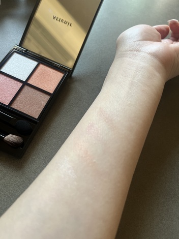 目元より腕の内側にシャドウを載せた方がカラーがわかりやすかったのでその写真です。各色一度塗りなので薄めに見えますが、これを重ねて自在に印象を操れるのでとても良いです!参考になると嬉しいです!