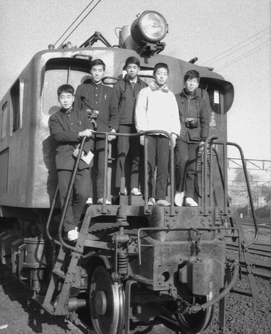大宮機関区見学でのELに関するネガを精査していると、私が写っている1枚が見つかりました。急いでディジタル化し、高品位化してみました。何せ私は撮るほうばっかりだったので、自分が写っている写真は殆どありません。向かって1番左が私です。