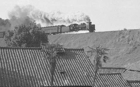 沿線に古い神社があったので、この古そうな鳥居越しに1枚撮りました。C57165号機牽引の下だり普通旅客列車でした。機関車がシルエットのようで、なかなか味のある絵に仕上がったような気がします。これを最後に仁万の地を離れました。 -