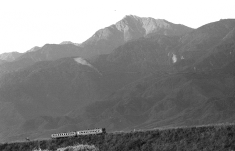 小淵沢の駅を出て、中央本線から分岐し、大きく180度旋回して甲斐大泉に向かう超大築堤です。目的とするC56牽引の貨物列車の前に通過する気動車です。この時間、背景の南アルプスは山肌が鮮明で、甲斐駒ヶ岳も鮮明に姿を現しました。