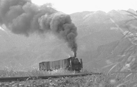 ここが雄大な南ア山脈を借景とした超大築堤です。C56150号機牽引の貨物列車がかなり近づいてきました。しかし残念ながら甲斐駒ヶ岳は完全に煙で隠されてしまいました。