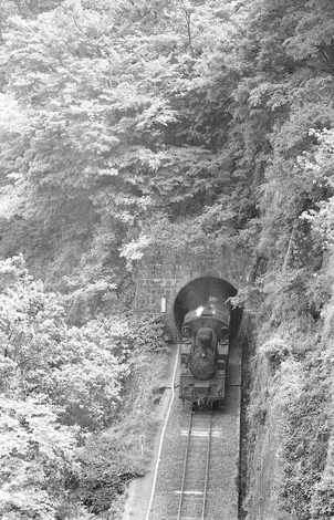 渡良瀬川高津戸峡の七曲隧道です。C1247号機牽引の下り貨物列車が一方的上り勾配を驀進しています。