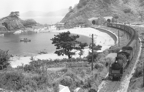 笹川流れとは異なる日本海の荒磯を暫くご堪能下さい。C5718号機牽引の上り普通旅客列車です。晩夏の穏やかな湾です。