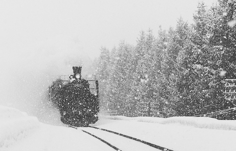 雪中の塩狩峠の駅に降り立った時、逆方向から雪煙を蹴上げてC551号機牽引上り普通旅客列車がホームへ駈け込んできました。-