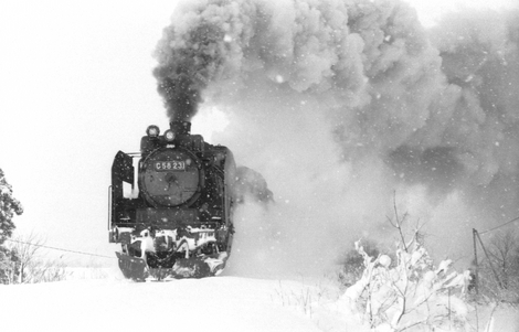 次の上り貨物列車は重連であることをダイヤで確認して、豪雪の中、線路脇で待期していました。雪煙を挙げて驀進してくる姿は鬼気迫るものがありましたが、前部補機のC58231号機の前部のみがはっきり見えて、本務機は凝結する蒸機に隠れてしまいました。遠景ショットでは辛うじて煙が2本確認できました。