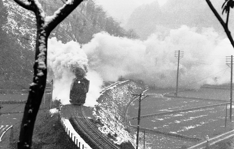 この日初めてお立ち台に立ったこともあって、みんながサーッと引き上げた後も、暫くここに留まっていました。その後、デコイチの単機回送や普通旅客列車がやって来ましたが、この日は特別に冷え込んだせいか、いずれも水蒸気の凝結が著しく、迫力シーンを見ることが出来ました。これは単機回送です。