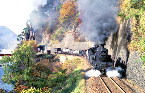 色づく秋の渡良瀬渓谷です。次のショットは列車と景色を両立させるフレーミングを狙いました。奇妙に感じたのはこの列車の本務機(C1246)が先頭に立っていることです。神土の駅で補機を待っている間に本務機を切り離して給水していたのですね。