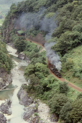 そして、この渓谷沿いの路線の全貌がこの写真です。季節は初夏の頃。この風光明媚な路線は、ちょっと上流に建設中の草木ダムの完成を待たずに、長いトンネルと長いガーター橋で出来た新線に切り替えられました。湖底に没しなかったのがせめてもの幸いです。