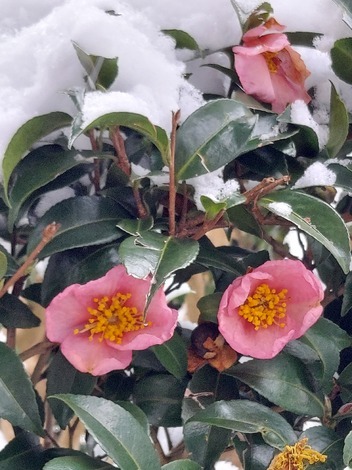サザンカ、冷たい雪の重みにも耐えて、綺麗に咲いていますね!