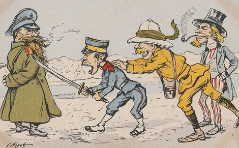 ※この風刺画のパロディはなかなか秀逸。元ネタは日露戦争時のフランス、ビゴーの風刺画だけど、この画はなかなか風刺が効いています。