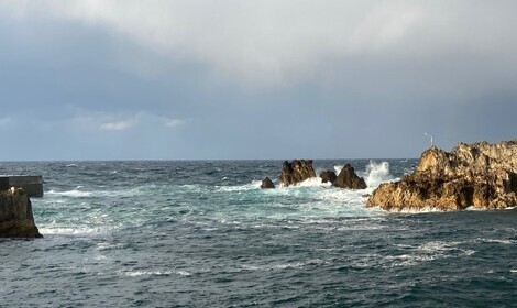 高波のシーズン到来。波の花も国道迄。