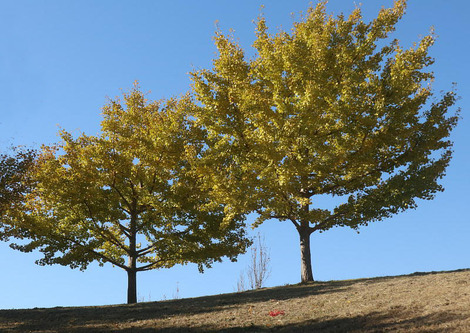 公園の銀杏はまだ緑っぽくてもう少しですね