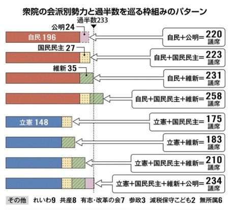 自民党➕維新が➕あと一つ保守系の日本新党か参政党が乗れば過半数確保できると、言うことは、立憲➕国民の旧民主党系は、過半は取れないつまり意味がなくなるただただ騒ぐ「野党」のままと言う事