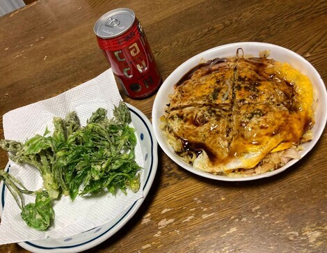 1)休日の晩酌として、山菜の天ぷらと近所のお好み焼き屋でテイクアウトした広島焼きといっしょに飲みました。