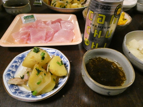 メバチマグロの刺身・じゃことわかめの和え物・温奴・ポテトサラダ