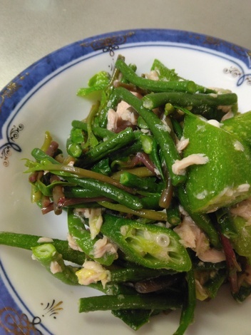 今朝のサラダは、うちで採れた野菜のオクラ、三尺ササゲ、ツルムラサキの茹でたのにツナ、アボカドを加えました。