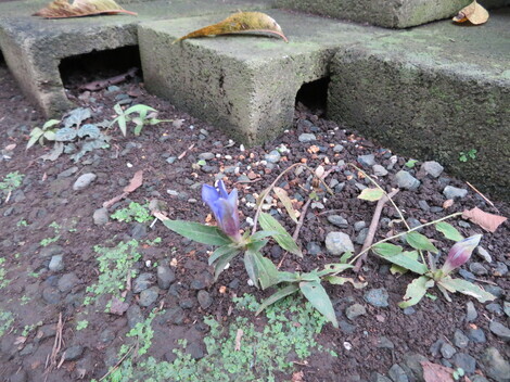 これがこぼれ種で生えて、小さいながらも花をつけた根性リンドウです。