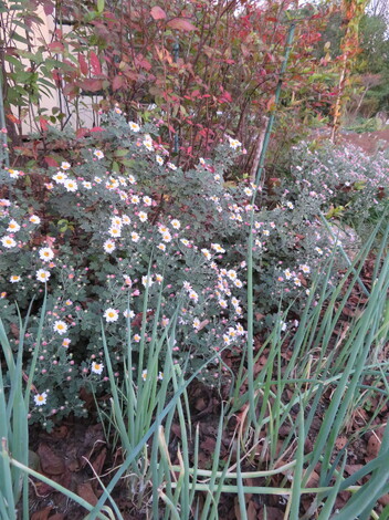 菊の後ろにあるのはヒメリョーブで、紅葉が早いので花材の枝ものとして人気がありますね。