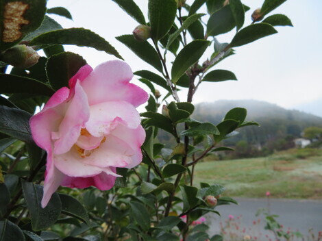 山茶花が咲いてきて紅葉も日ごとに進んでいます。今朝は山に霧がかかりました。