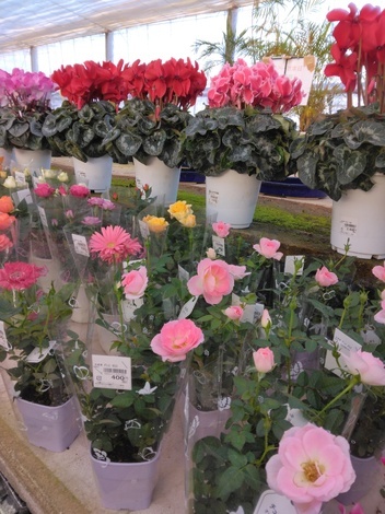 並んでいる鉢花はシクラメンが多くて、苗はパンジー、葉ボタンかな。