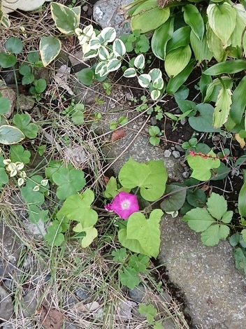 種は蒔いてないのに、ひと月くらい前に🌱が出てきて、ツルが20cm程伸びて「あれ?」と思ったらやっぱり朝顔の葉らしいのが出てきて…そして今日の夕方外出から帰った時に花が咲いているのを見つけました。小さな朝顔です。可愛らしいです。