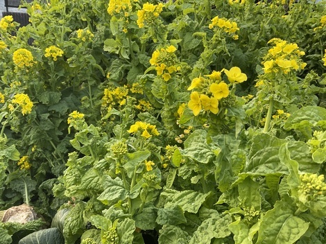 庭の畑では菜花が満開になり