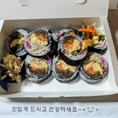 おはようございます〜♪未来さん、韓国🇰🇷ですか😳キンパ、美味しそう😋 文字の後^_^良いわぁ