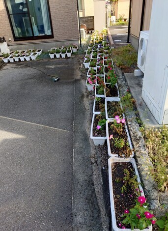 8:37🌺はなさん🌺おはよ-ざいま-通所デイ前.花壇大量散水しました枯花奥地へ.咲花手前に移動でした最後の最後.咲く花.見せたいので