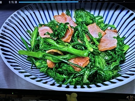 朝から晩酌のドラマ見てますわその前には何みたのだったかな?早く起きてもテレビ鑑賞春菊とベーコンの炒め物セロリ餃子も作っていたわね。さつまいも🍠ケーキレンジでチンで頂きました。