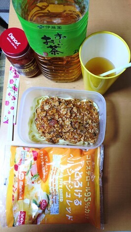 22:35.みなさん.こんばんは🎑平麺パスタ🍝完食しました一次.ピリ辛ハヤシ🍛5回分のみちまちま完食ガンがります…zzz