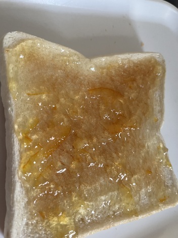 7時40分朝ごパン食べました。蕁麻疹心配なので、マーマレードです。