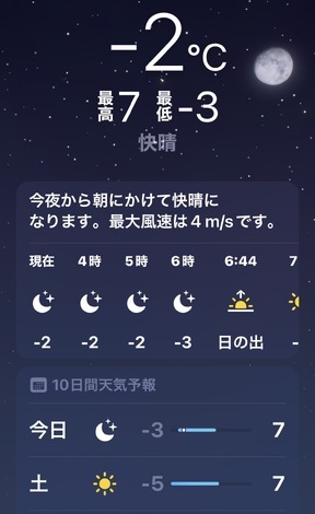 3時25分トイレでした。前日に見たら−4度まで下がるとありましたが今−2度見たいね昨日は寒気してたくさん着込んで寝ていました。またまた頭痛の朝