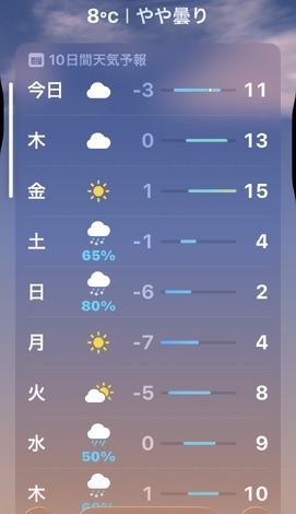 かなさんおはようございます〜5時15分になりましたね。木曜日でしたね。ゴミの日です。今日、明日は暖かい日になるのかな?土日がまた寒くなるみたいこちらの週間予定