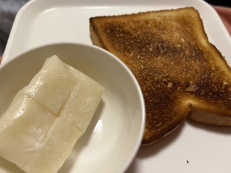 ご飯無くなったので、パンに餅焼きまして食べました。