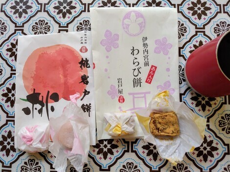 お土産の桃岩戸餅とあん入りわらび餅を食べました。