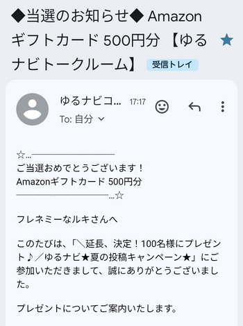 ゆるナビの夏のキャンペーンが当たり、Amazonクーポンを頂きました。
