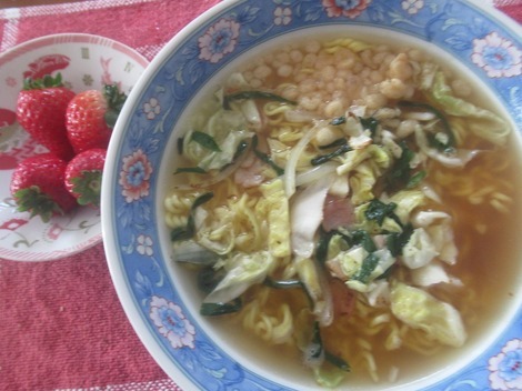 味噌ラーメン(袋麺)、イチゴ、リンゴ