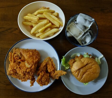 チキンバーガー、ピリ辛チキン、フライドポテトなどを食べました