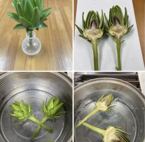 何年か前に家で育てたアーティチョークですお花も咲かせてみたかったのですが花が2つついてくれて食べたくなってみた私はつい調理してしまいました、食べれる部分はすくないけれどおいしかったです、