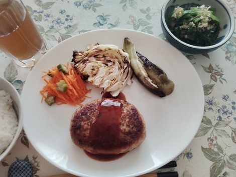 ごはん、ハンバーグ、茹で小松菜を食べました。