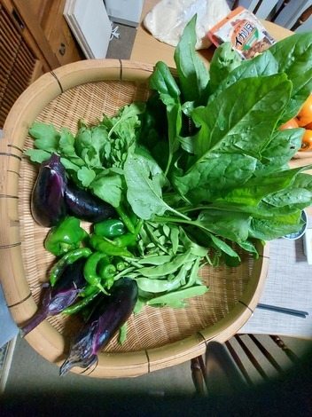 夏野菜(ゴーヤー、ほうれん草、春菊、その他)の写真をありがとうございます📷️🧺🥒🥬🍆😺