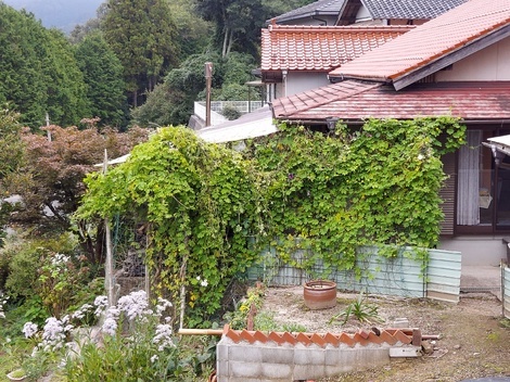 18年目の煙突の手前に青々と繁っている緑の植物は、ムカゴ(ツクネイモ)の葉と弦なのか、ナ