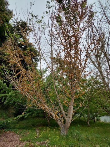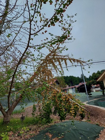 銀杏も今年の夏の暑さと水不足で、葉っぱが早くに落ちたり、水気の多いところはまだ青々としています。